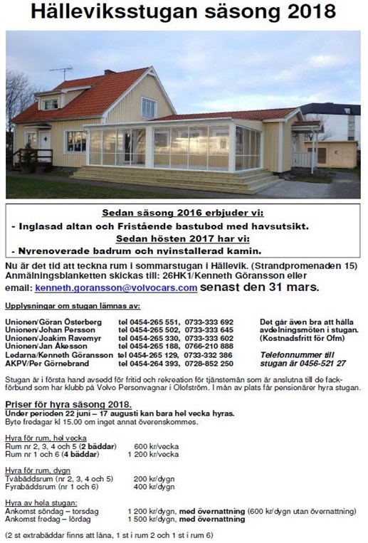 Bokningar för säsongen, se separat utskick via e-post 180213